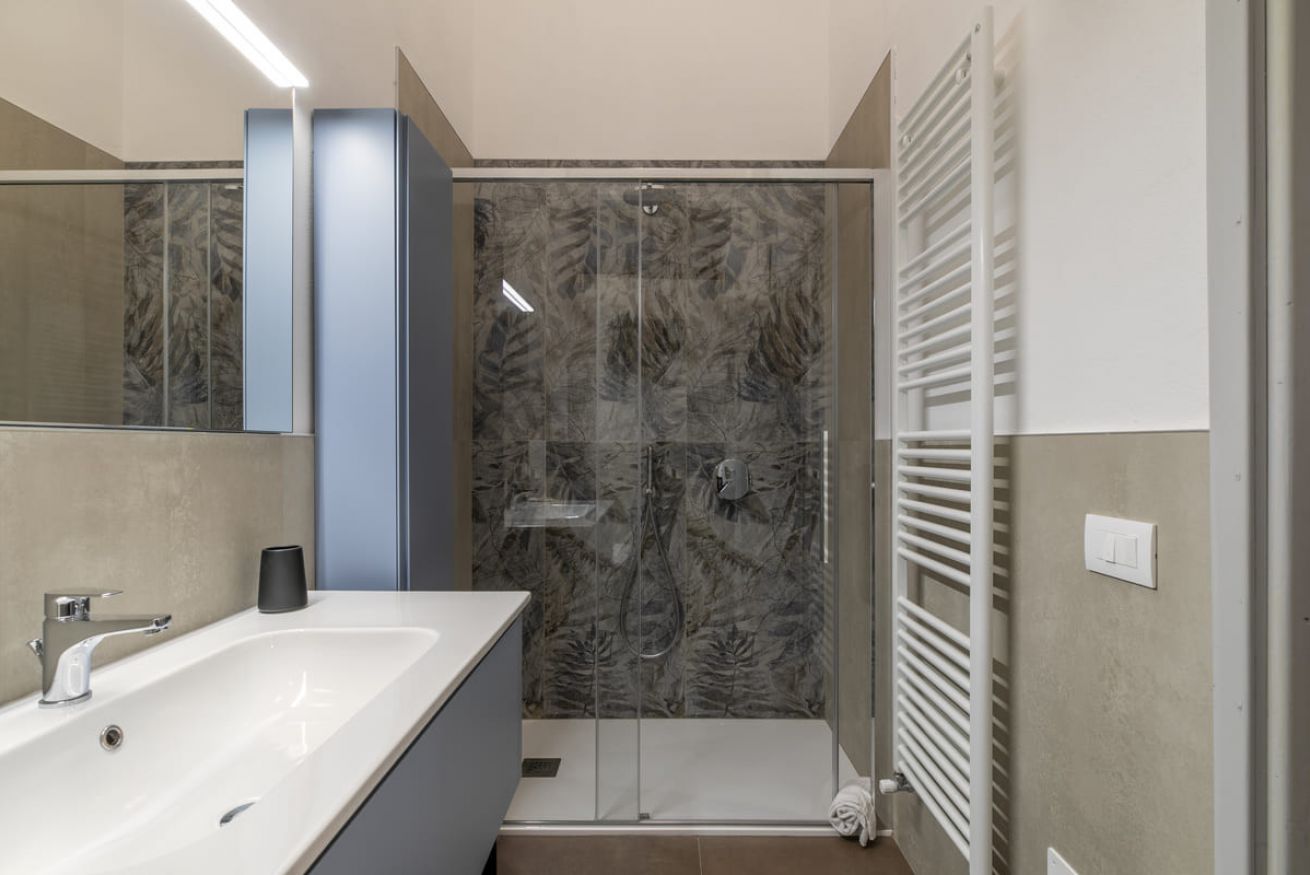 Bagno: Bagno moderno con doccia e lavatrice, progettato per offrire il massimo comfort.