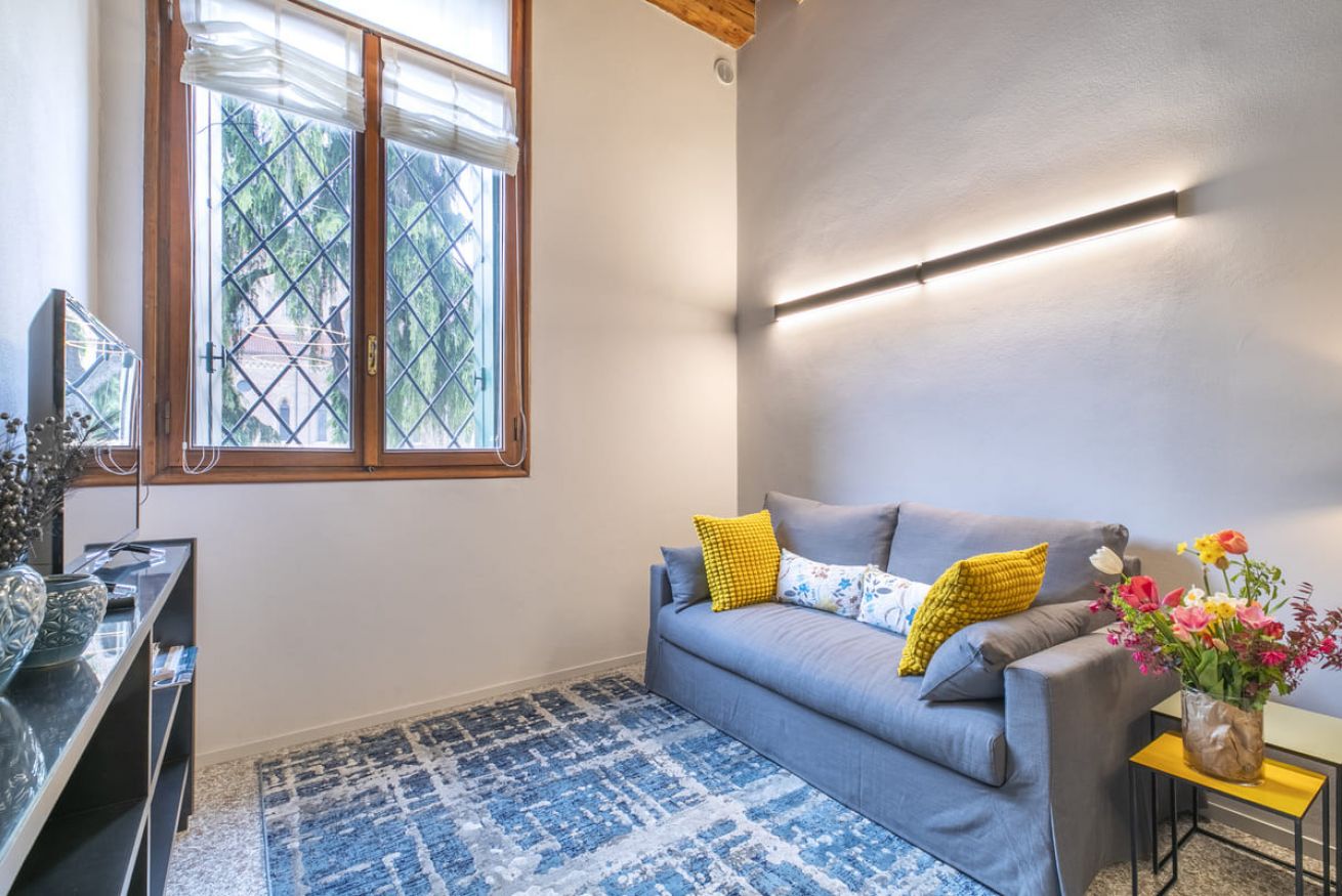 Zona Giorno: Zona giorno spaziosa e luminosa, un'area relax con un comodo divano letto e TV, perfetta per rilassarsi dopo una giornata di passeggiate.