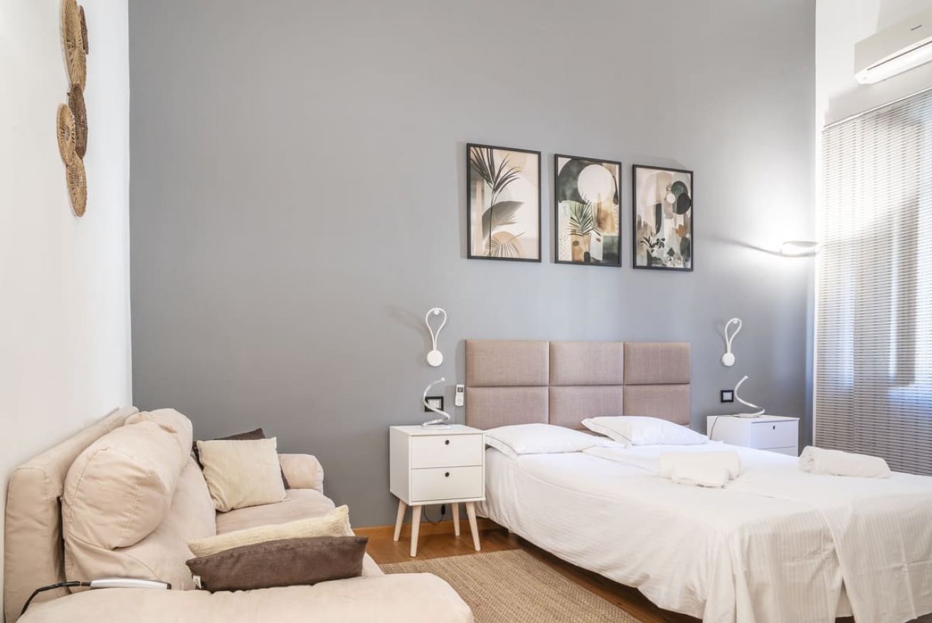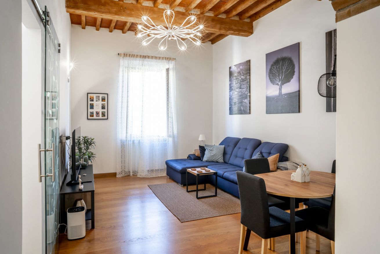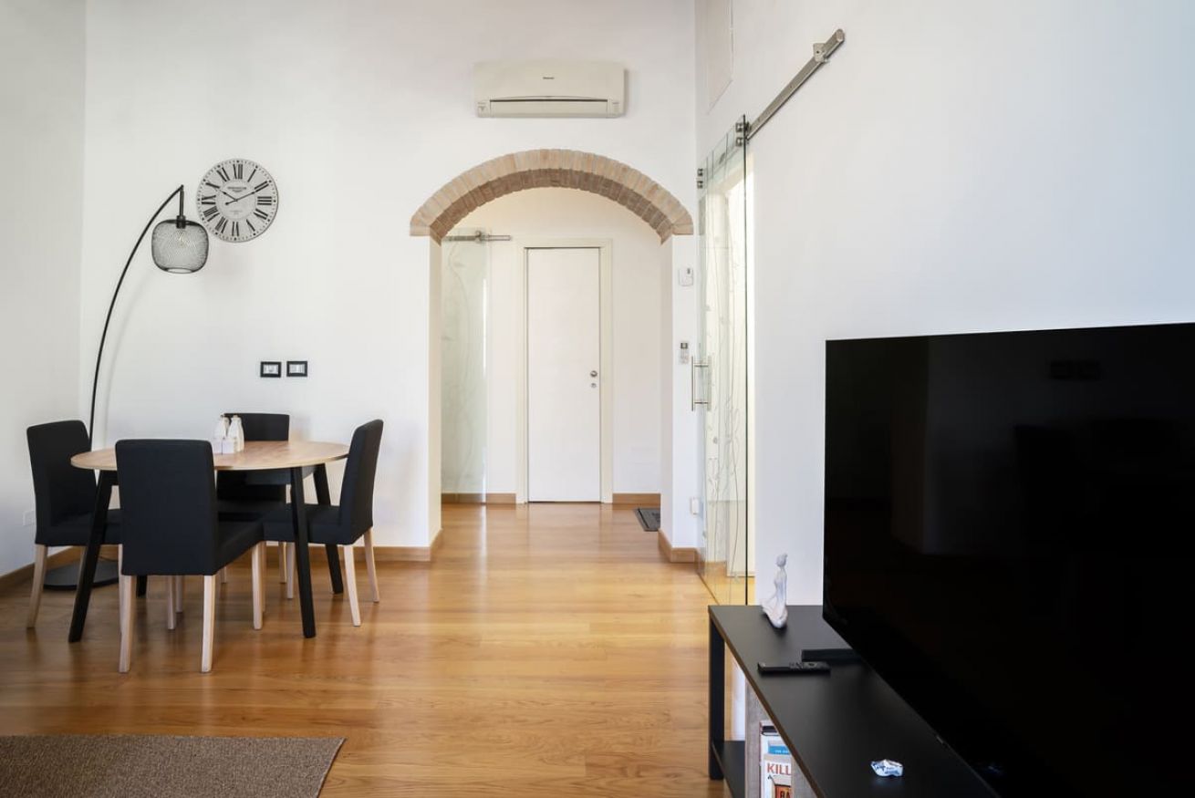 Zona giorno: Il soggiorno è spazioso e luminoso, dotata di un divano letto e una smart TV, ideale per rilassarsi dopo una giornata di esplorazione. Un tavolo da pranzo offre spazio per cenare insieme.