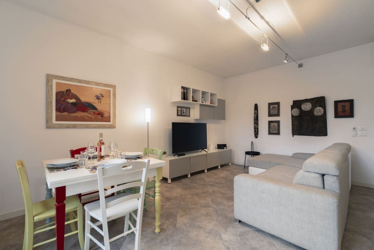 Zona Giorno: luminoso open space che comprende una cucina completa di tutto il necessario per preparare i vostri pasti e un accogliente angolo relax con divano letto e Smart TV, perfetto per le serate in compagnia.