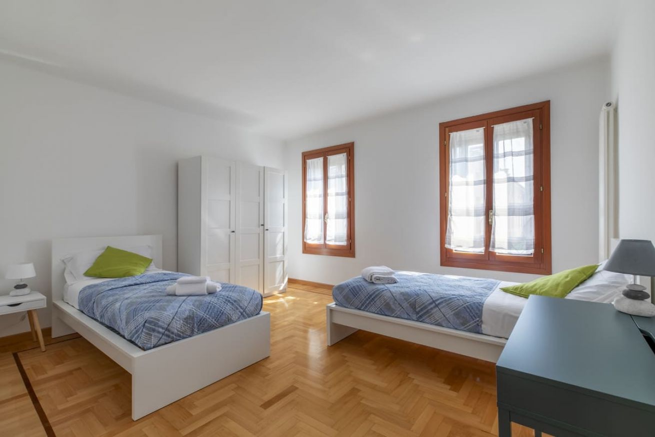 Camere da Letto: Una spaziosa camera matrimoniala e una camera doppia con letti singoli e dotata di scrivania, perfetta per bambini o ospiti.